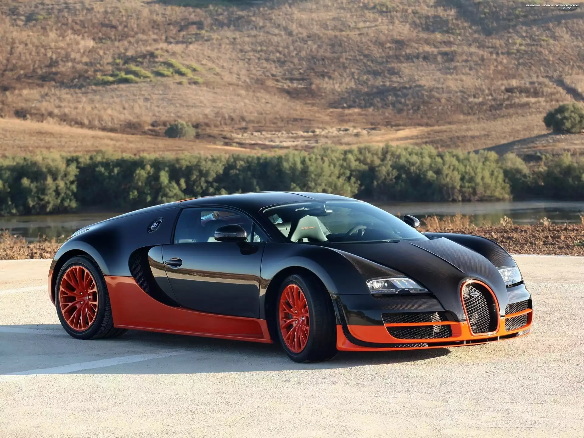 Rzeka, Zbocze, Bugatti Veyron Super Sport, Drzewa- Zdjęcia samochodów